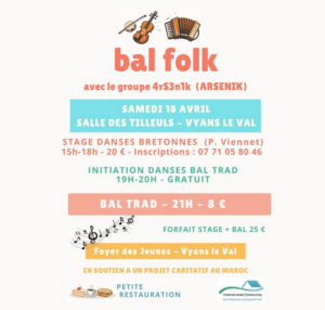 Super soirée en perspective avec stage et initiation à la danse puis bal pour soutenir un beau projet au Maroc.
