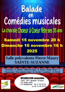 À l’occasion de ses 35 ans, la chorale Chœur à Cœur a le plaisir de vous inviter au concert « Balade en Comédies Musicales » programmé à la salle polyvalente Pierre Maury de Sainte-Suzanne les :
