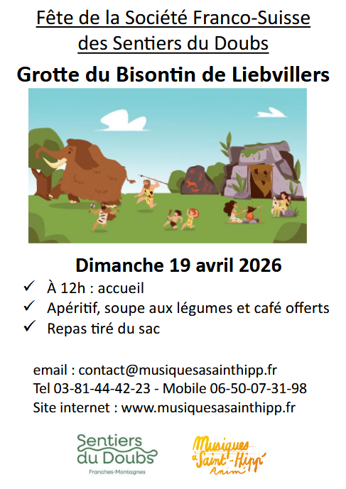 La société franco-suisse « les sentiers du Doubs » et les marcheurs de notre association MASHA vous invitent à la fête de la Grotte du Bisontin à Liebvillers qui se déroulera le Dimanche 19 avril 2026 à partir de 12h
